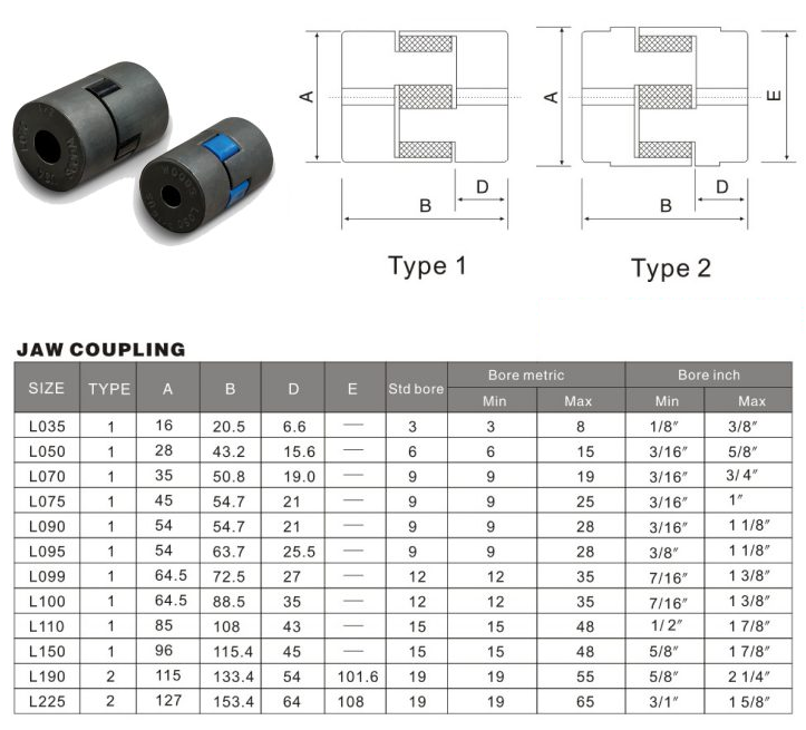 Các model/size của khớp nối JAW: L035, L050, L070, L075, L090, L095, L099, L100, L110, L150, L190, L225
